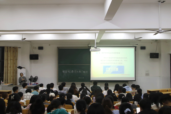 培训班上,容家宁老师首先从团学干部的作用进行讲解,让同学们了解到团学干部的主要作用以及如何成为优秀的团学干部。随后,容老师指出了学院团学干部存在“少数学生干部思想道德素养有待提高”、“学习成绩有待进一步提高”和“部分学生干部当选后目标不明确”等问题。接着,容老师就团学干部所存在的问题提出一系列的改进方法。容老师认为,作为团学干部应具备思想政治素质、道德素质、文化素质和心理素质的这四个基础修养,以及学习能力、交际能力、创新思维能力、组织管理能力、分析解决问题能力、宣传鼓动能力和规划决策能力的七大能力。在培训课最后,容家宁老师给我们团学干部分享了提升公文写作宝典。