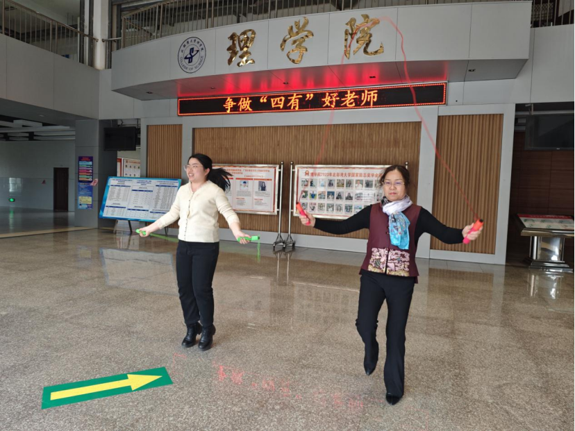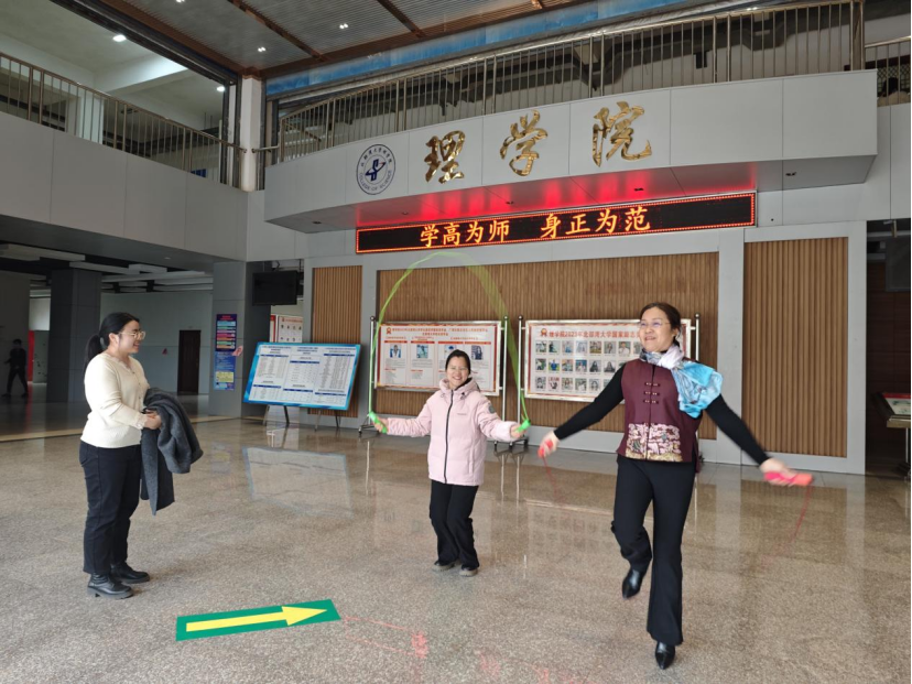 活动分为二个环节:环节一,学院党委书记黄嵘、院长苏华东组织女教师座谈;环节二,跳绳闯关,开心过节。