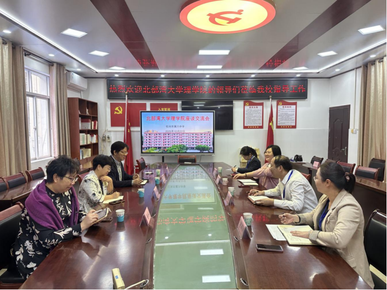座谈会上,莫怡发校长详细介绍了钦州六中的发展历程、办学特色及教育教学成果,充分展现了学校近年来稳步向好的发展态势。严丽丽书记回顾了两校长期以来的友好合作基础,明确提出希望在党建共建、教研联动、师范生实践培养等领域进一步拓宽合作维度。会上,钦州六中还对北部湾大学毕业生的工作表现给予高度评价,认为毕业生责任心强、奉献精神突出,其专业素养与学生管理能力均获得学校同事及学生的广泛认可。黄嵘书记、苏华东院长代表理学院对钦州六中的热情接待及对毕业生的高度认可表示诚挚感谢,随后双方围绕教研科研项目合作、师范生实践基地建设、深化访企拓岗、搭建校友交流平台等方面的合作深化展开重点研讨,双方初步达成合作共识。