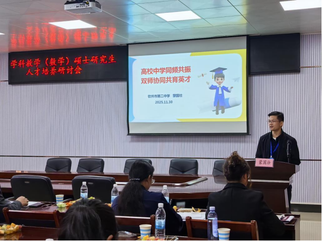 为深化理学院学科教学(数学)研究生教育改革,精准对接基础教育发展需求,11月30日,北部湾大学理学院学科教学(数学)硕士研究生人才培养研讨会在1B-319顺利举行,来自钦州市多所重点中学的教学名师及理学院师生代表共50余人齐聚一堂,围绕数学教育专业硕士培养高质量发展展开深入研讨。