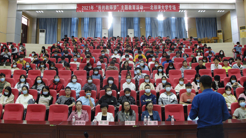 为深入学习领会习近平总书记“七一”重要讲话精神,引导广大教师不忘立德树人的初心,牢记为党育人、为国育才的使命,10月21日下午,在3号教学楼101报告厅开展了“我的教师梦”主题教育活动。由桂林市桂林中学校长马劲老师主讲。理学院党委书记黄嵘、党委副书记容家宁,我校部分师范生参加了活动。