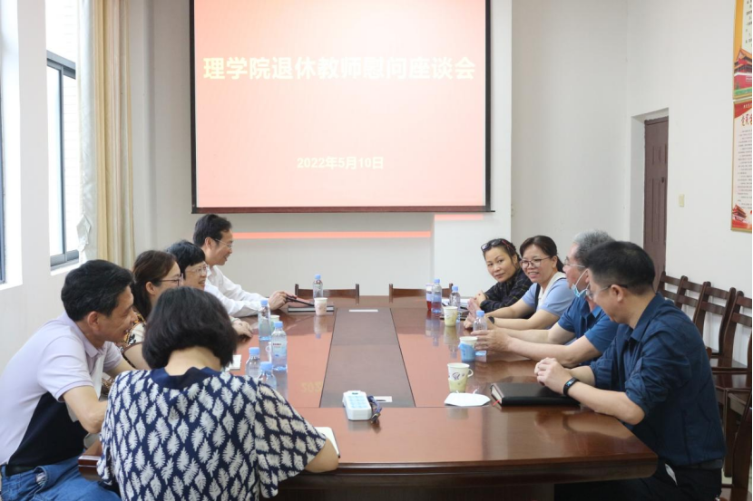 2022年5月10日下午,理学院在1C-338室举行退休教师慰问座谈会。学校工会副主席莫秀群、离退处副处长封彬贤,理学院领导、教师代表和刚退休的黄岳俊老师参加了座谈会。座谈会由理学院党委书记黄嵘主持。