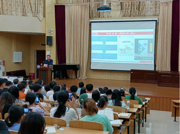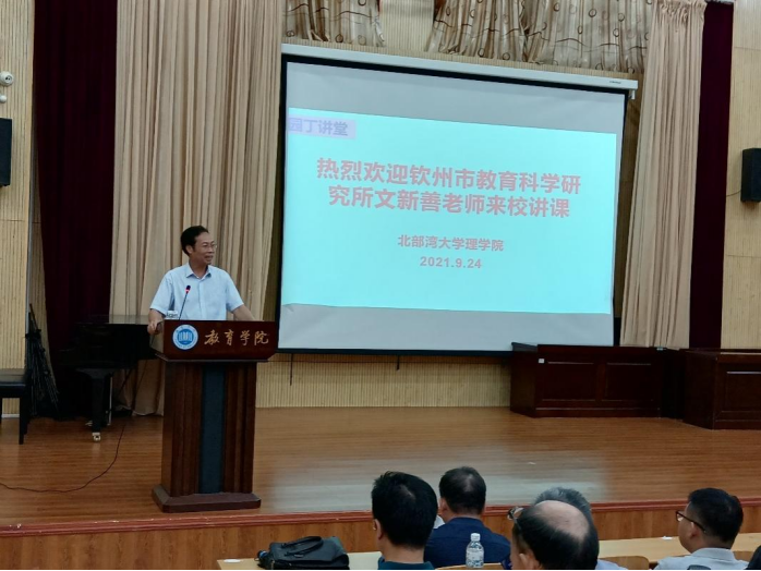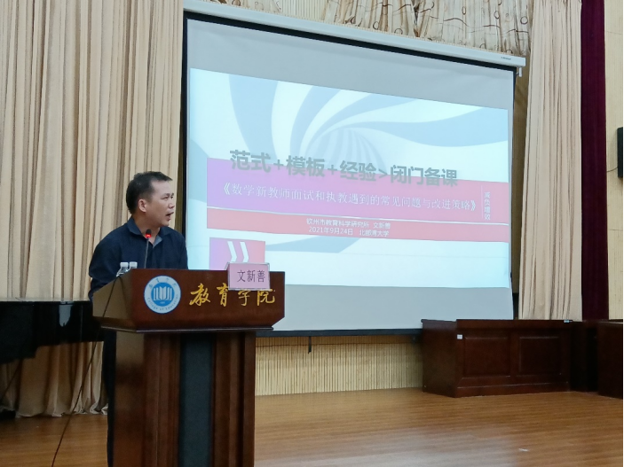 2021年9月24日晚上,理学院在一号教学楼1B-115教室举办“园丁讲堂”活动之“数学新教师面试和执教遇到的常见问题与改进策略”专题讲座,我院数应本181班、191班和192班全体同学参加了讲座。此次讲座由钦州市教育科学研究所中学高级教师文新善老师主讲,理学院院长梁好翠主持。