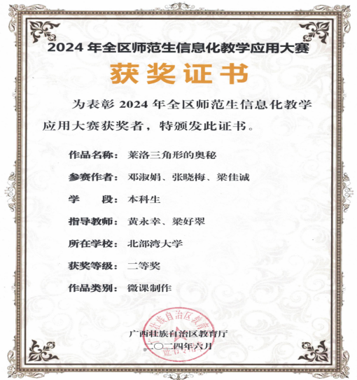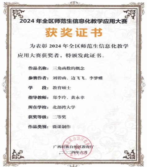 近日,2024年全区师范生信息化教学应用大赛落下帷幕,理学院学子凭借扎实的专业知识、创新的教学理念和出色的信息化教学技能,在众多参赛选手中脱颖而出,获得二等奖两项。
