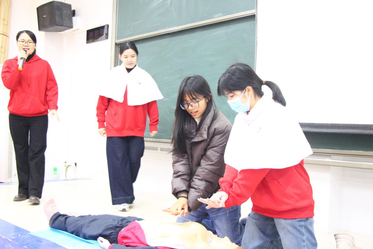 会上,刘梅主任医师聚焦月经健康话题,希望女生们走出误区,科学应对,并给出了饮食、运动、压力管理等方面的调理建议;梁洁副主任医师讲解了科学终止妊娠的选择、人流作为补救措施的复杂性和潜在风险,强调做好个人防护措施的重要性;阮玉玲副主任医师围绕HPV病毒,讲解了疫苗的防御作用、接种常见问题,倡导女性接种HPV疫苗,预防宫颈癌。最后,钦州市第一人民医院志愿护理服务队现场演示心肺复苏流程,详细讲解了每一个步骤的要点,并邀请同学上台实操,让同学在实践中掌握这一重要的急救技能,提升应对突发状况的能力。