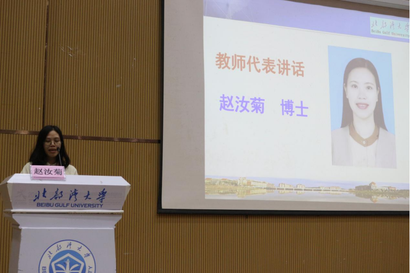 赵汝菊博士和潘文剑博士作为学院教师代表发言。赵汝菊博士希望同学们能在老师的引领下感受到数学的严谨与浪漫,珍惜美好的青春时光,为未来的生活交上一份满意的答卷。潘文剑博士希望同学们能树立远大的理想,形成良好的学习、生活习惯,同时懂得感恩与包容,在未来的四年能取得累累硕果,活出人生的精彩。