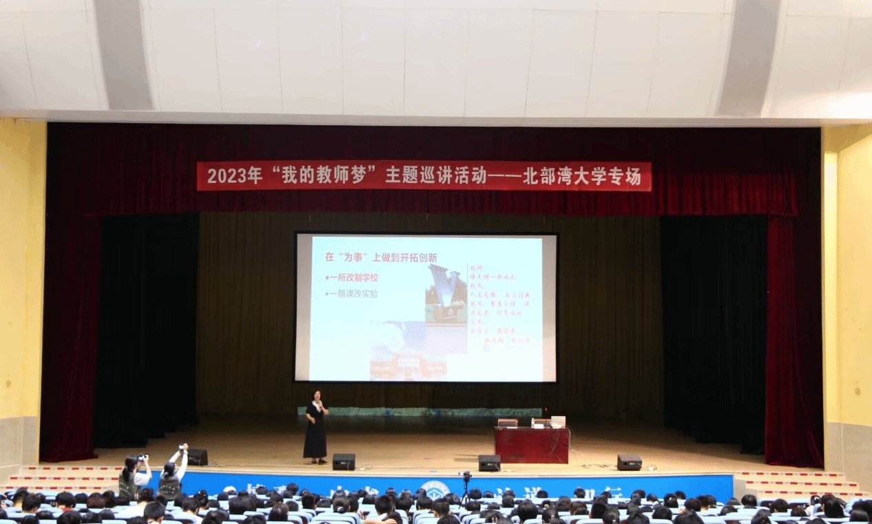 2023年10月17日晚,北部湾大学理学院在学校礼堂开展了我的教师梦”主题巡讲活动。本次教育活动由桂林市桂林中学副校长周平老师主讲。理学院党委书记黄嵘、理学院党委副书记容家宁、理学院辅导员庞悦、理学院辅导员王宇清以及我校师范类专业共一千余名学生参加。