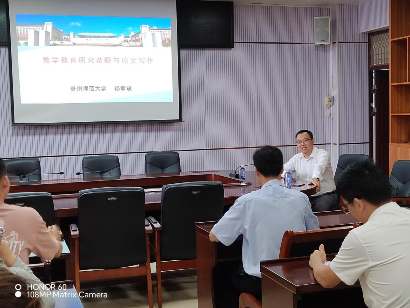 2024年10月21日上午,贵州师范大学杨孝斌教授应邀到理学院1B-319会议室作了题为“数学教育研究选题与论文写作”的报告,2023级和2024级学科教学(数学)硕士研究生、全体学科教学(数学)研究生导师、理学院部分教师参加了报告会。报告会由理学院院长梁好翠教授主持。