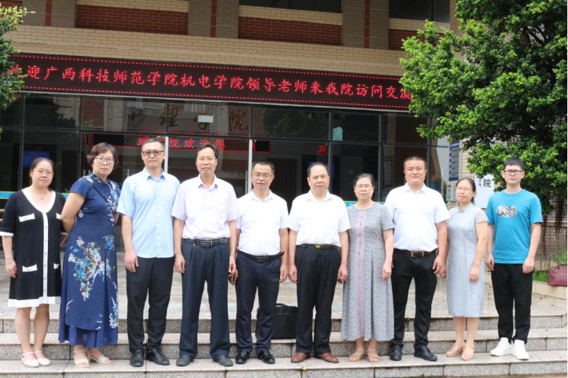 2022年6月29日上午,广西科技师范学院机械与电气工程学院潘晓明副院长一行6人到理学院访问交流。首先,参观了理学院实验室、师范技能训练室、图书资料室等办学场所和教学成果展,然后,在1B-319会议室举行交流座谈会,理学院梁好翠院长、谢文彬副院长、孙立萍教授、物理教研室谢冰主任和理学实验中心吴兹起主任参加座谈会。