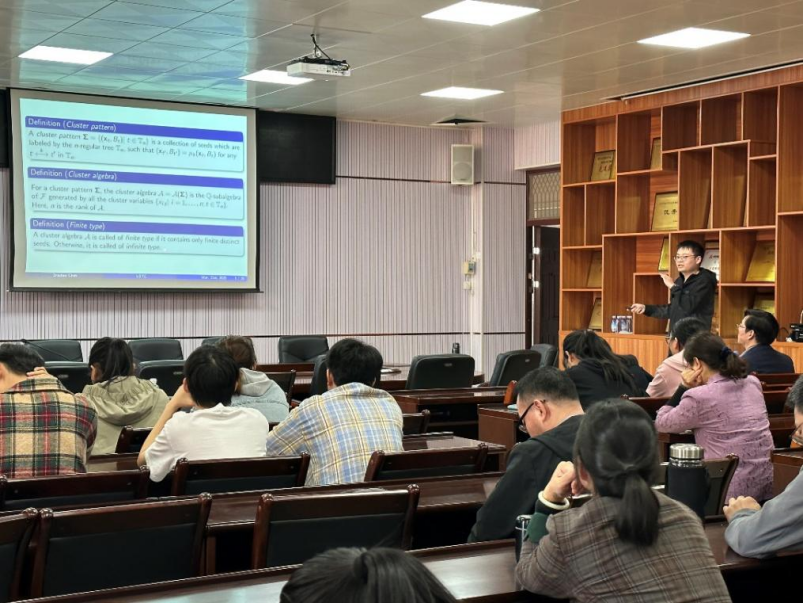 2025年3月21日下午,中国科学技术大学数学学院陈智超博士应北部湾大学理学院的邀请,在理学院1B-319会议室作了题为“Mutation invariants of cluster algebras of rank 2”的学术报告,北部湾大学理学院院长苏华东教授、理学院副院长郑李玲副教授、理学院数学教师和研究生参加了报告会。报告会由苏华东院长主持。