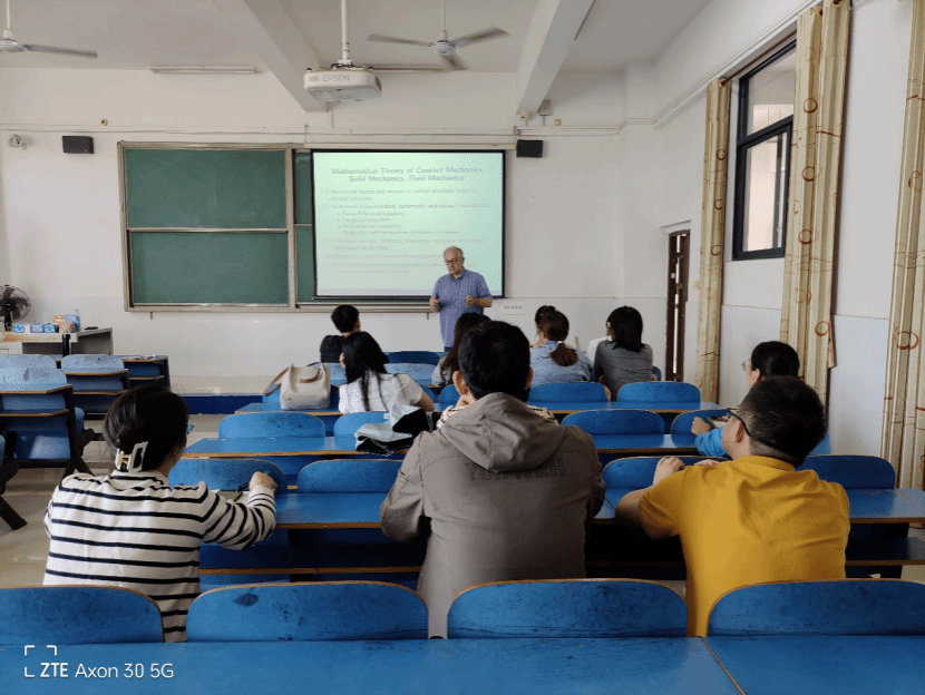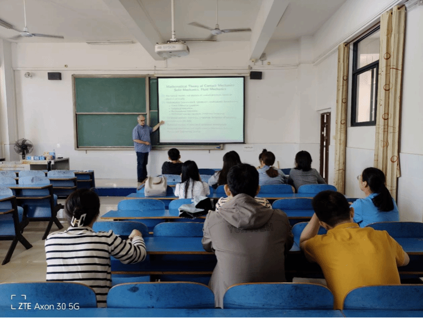 2023年10月12日下午,理学院特聘教授Stanislaw Migorski应邀在1C-220教室给2023级数学硕士研究生作题为“Nonsmooth Problems in Contact Mechanics”的讲座。理学院部分老师聆听了讲座。