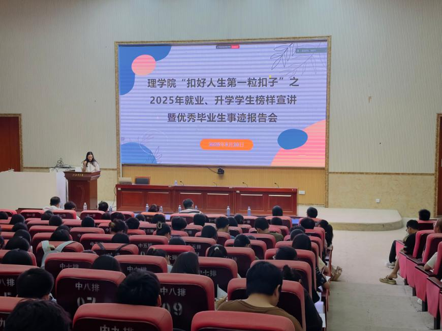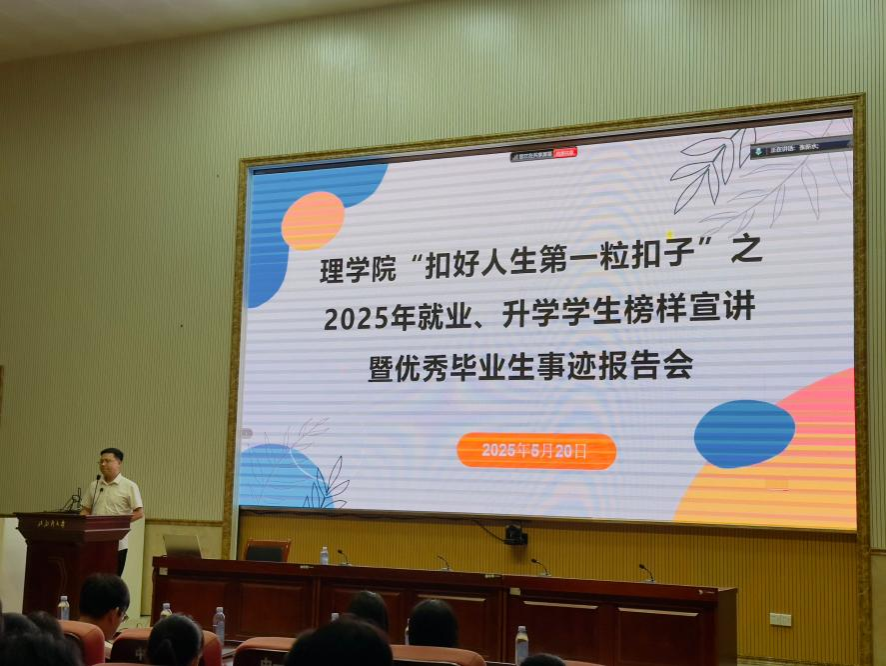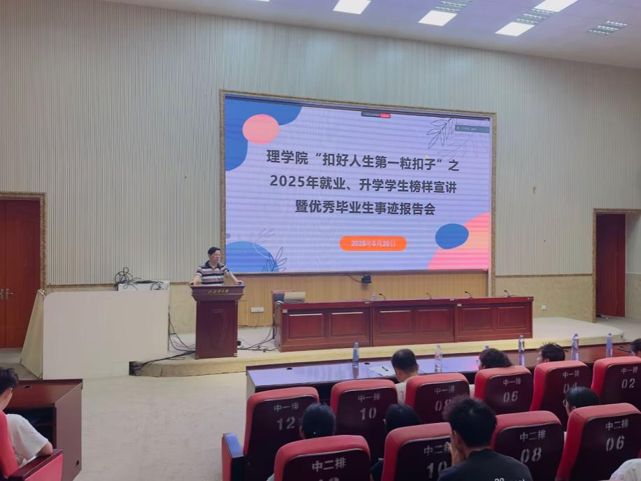 为助力学生做好就业与升学规划,5月20日,理学院成功举办“扣好人生第一粒扣子”2025 年就业、升学学生榜样宣讲暨优秀毕业生事迹报告会。理学院院长苏华东,副书记劳靖,副教授赵汝菊、黄立壮,辅导员王宇清出席,2025届优秀毕业生代表、2022级全体同学参加会议。