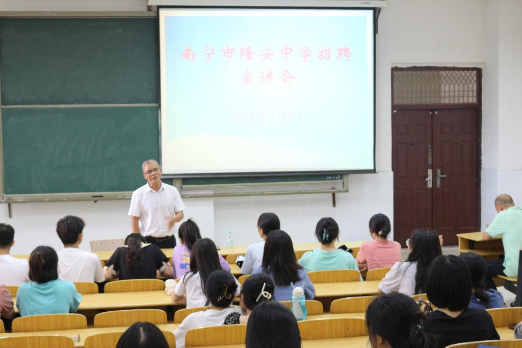 宣讲会上,农校长介绍了南宁市隆安中学的建校历史和成就,向同学们介绍了学校的师资,办学规模,聘用方式,绩效发放和职称评审等方面详细情况。农校长对现场同学进行答疑,并介绍了南宁市隆安中学良好的职业发展和未来前景。