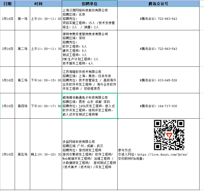 招聘会分五场举行,用人单位通过线上宣讲的方式,详细介绍了公司情况、岗位职责和应聘要求,让毕业生了解了用人单位的招聘需求,加强了毕业生与企业的交流。参与招聘的用人单位有上海泛微网络科技股份有限公司、深圳市默贝克驱动技术有限公司、江苏海隆软件技术有限公司、威海精讯畅通电子科技有限公司、多益网络科技有限公司,面向我校毕业生招聘近50名学生,主要涉及大数据研发工程师、软件开发工程师、技术服务工程师等岗位。