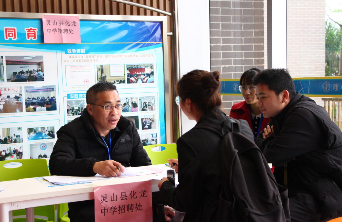 为更好地了解钦州市各县区教师招聘的社会需求,促进师范毕业生更充分就业。2023年3月28日上午,灵山县教育局在理学院开展教师专场招聘双选会,我院党委书记黄嵘、副书记容家宁与灵山县教育局副局长黄冬兰、人事股股长劳展琛等现场进行交流,开展访企拓岗专项行动。