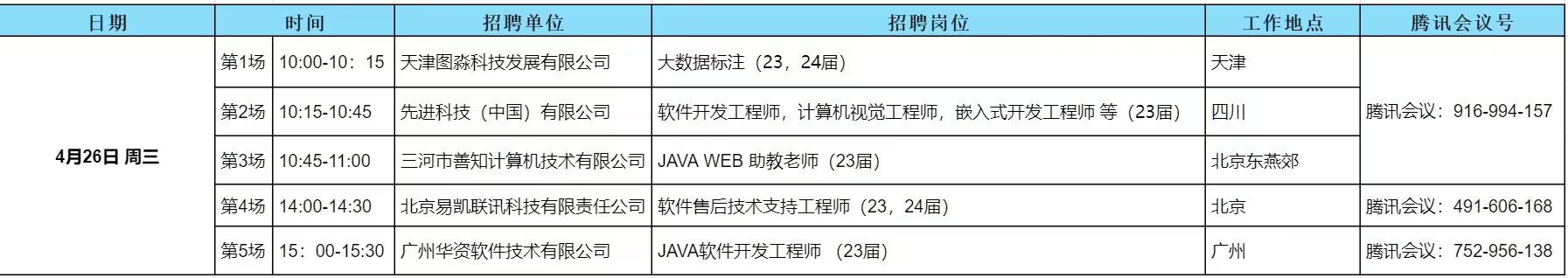 参与此次招聘会的用人单位有天津图淼科技发展有限公司、先进科技(中国)有限公司、三河市善知计算机技术有限公司、北京易凯联讯科技有限责任公司、广州华资软件技术有限公司等5家企业,招聘软件开发工程师,计算机视觉工程师,嵌入式开发工程师、JAVA WEB助教老师、软件售后技术支持工程师、大数据标注、JAVA软件开发工程师等7个岗位,提供就业岗位15个。