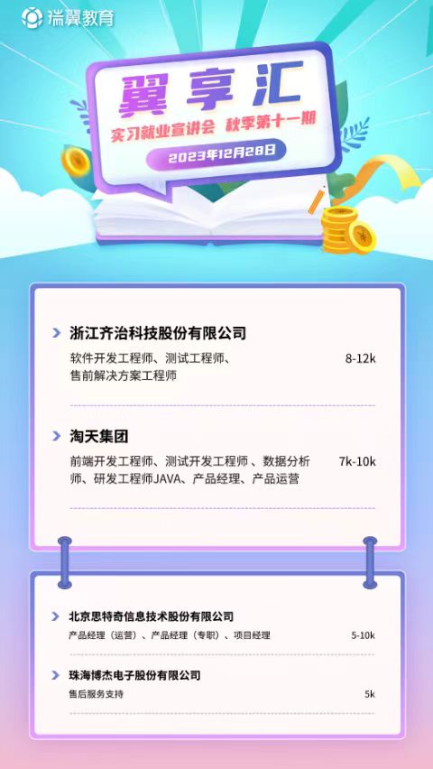 宣讲会分十一期举行,用人单位通过线上宣讲的方式,详细介绍了公司情况、岗位职责和应聘要求,让毕业生了解了用人单位的招聘需求,加强了毕业生与企业的交流。第十一期宣讲会参与招聘的用人单位有浙江齐治科技股份有限公司、淘天集团、北京思特奇信息技术股份有限公司和珠海博杰电子股份有限公司等四家公司,面向我校毕业生招聘近30名学生,主要涉及软件开发工程师、售前解决方案工程师、前端开发工程师、产品经理、和研发工程师Java等岗位。