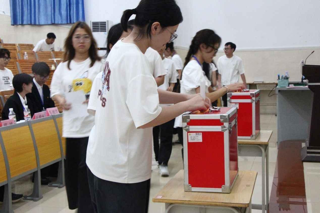 正式会议第二阶段,由韦思茵等4名学生会主席团候选人依次上台进行个人信息介绍。经过民主选举投票后,最终选举出了3位北部湾大学理学院第七届学生会主席团成员,他们分别是韦思茵、周佳佳、林美琪。最后,本次大会在团歌声中顺利闭幕。