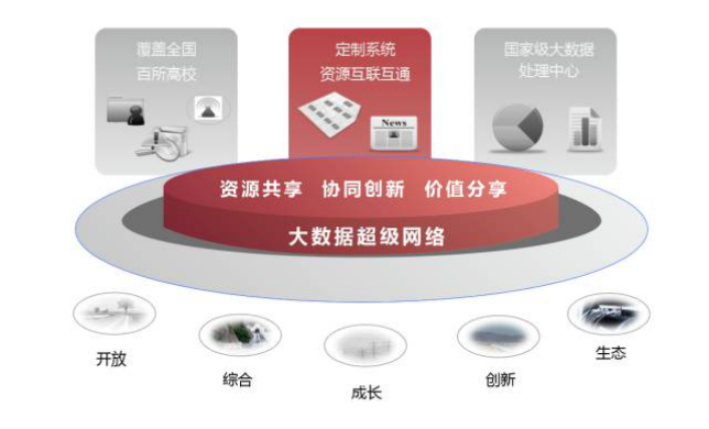 创新中心结合大数据行业与技术需求,采用分布式结构设计建设,打破信息孤岛,将参与数据中国”百校工程”的各校创新中心进行联网,实现硬件资源、行业应用创新的共享和交互,构建一个物理分离,逻辑统一的“大数据超级平台——Infinity 9000”,发挥运算资源、数据资源、人才聚集的协同优势,提升创新中心及联合体的技术创新与应用能力。