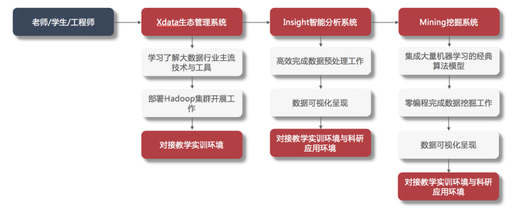 创新中心的学习科研环境提供有“Xdata生态管理系统”、“Insight智能分析系统”以及“Mining挖掘系统”三大行业级的科研系统,满足高校学生和老师各类学习需求与科研需求,同时,结合线上线下一体化教学、工程师入校混编以及1+1协同指点等方式确保高校科研能力的稳步提升。