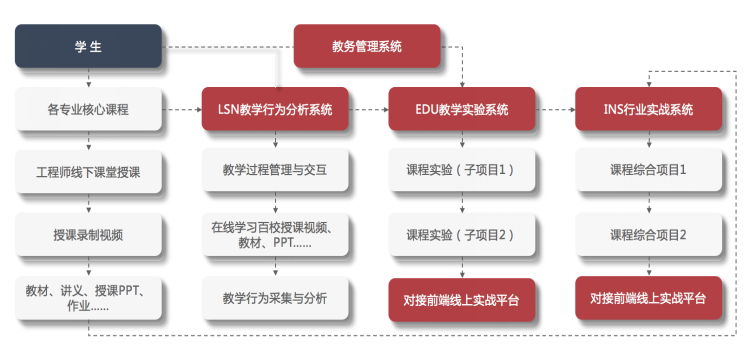 创新中心教学实训环境为更好的实施垂直整合化项目(VIP)教学体系,落实工程场景教学的方式,教学实训环境设计了四个子系统:“LSN教学行为分析系统”、“EDU教学实验系统“、“INS行业实战系统”以及辅助系统“教务管理系统”。