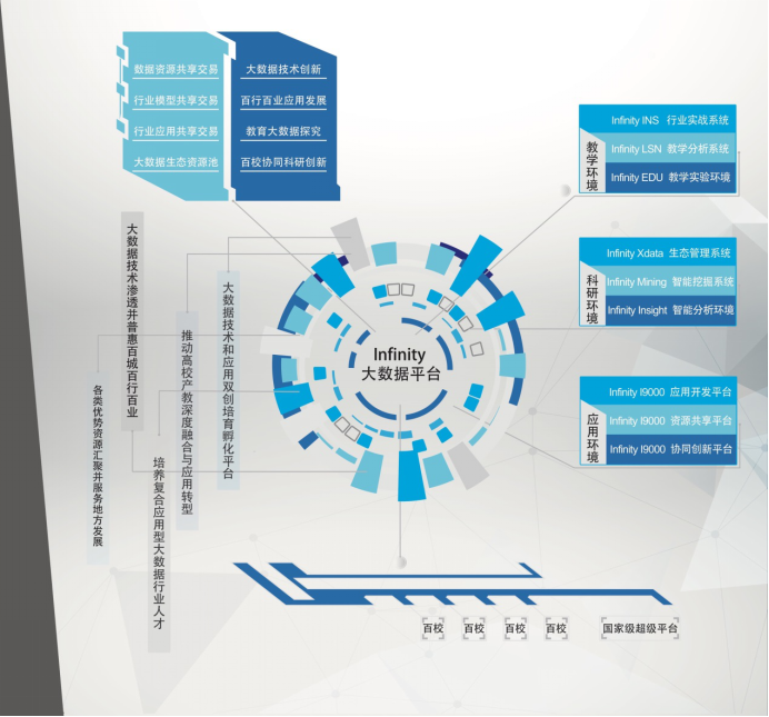 创新中心搭建的稳定、高效、可实现集中管控的“大数据应用超级系统-Infinity 9000”,为大数据教学、科研实践及行业应用创新提供基础性支撑;同时还将参与数据中国”百校工程”的各校平台实现硬件资源、行业应用创新的共享和交互,构建一个物理分离,逻辑统一的超级大数据平台构建有“教学实训环境”、“学习科研环境”以及“生产应用环境”。
