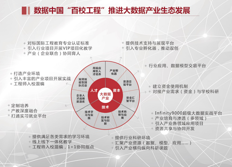 为响应国家“十三五”规划(2016-2020)中提出的实施国家大数据战略。教育部学校规划建设发展中心联合曙光信息系产业股份有限公司(以下简称中科曙光)发起的数据中国“百校工程”产教融合创新项目(以下简称数据中国“百校工程”项目),即在全国范围内遴选百所高校,部署集人才培养、科研支撑、行业应用及社会服务于一体的“曙光大数据学院”、“曙光大数据应用创新中心”,构建大数据应用协同创新网络,聚焦大数据关键技术及若干国家重点行业的大数据应用,开展产、学、研、用协同创新,为教育及其它行业提供全方位的数据服务。